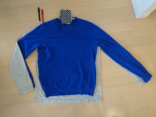 これは、某メーカーのセーターで、同じサイズの違うアイテム同士を重ねてみた物です。