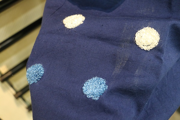 裾のドットを手刺繍で仕上げた青いワンピースは