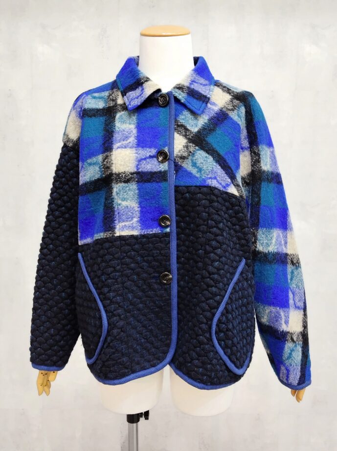 このブルゾンのチェック柄は、ただ単調に並んでいるのではなく、縦、横、斜めと、柄の向きがランダムに組み合わされているんです。