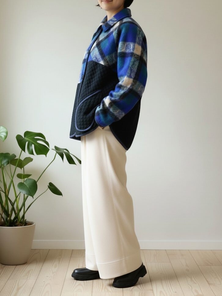 例えば、ゆったりとしたワイドパンツ(セミワイドパンツ)と合わせてみてください。ショート丈のアウターは、ボリュームのあるボトムスと相性抜群。重心が上に上がるので、脚長効果も期待できます。
