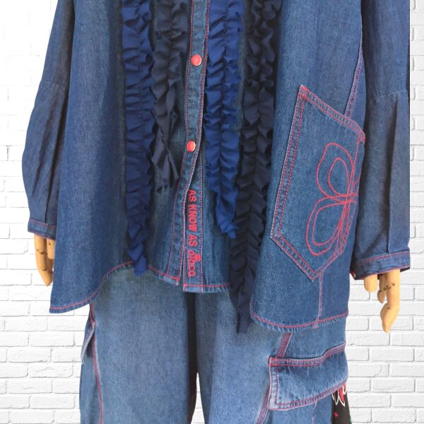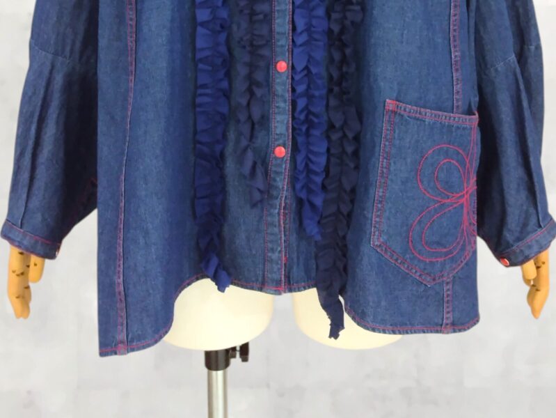 胸ポケットの上からあえてフリルを重ねたリメイク風のデザインや、前裾ポケットに施された繊細な刺繍。