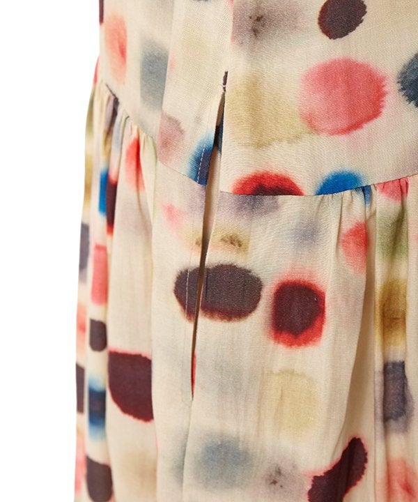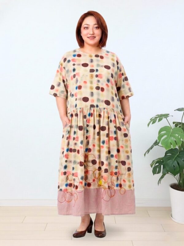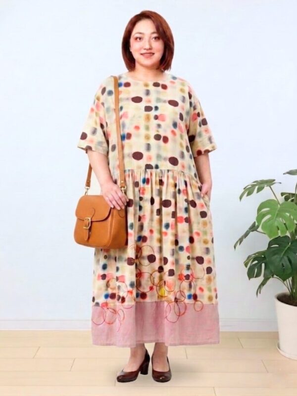 このワンピースに使われているのはモヤがかった水玉プリント。くっきりとした水玉ではなく、輪郭がやわらかくにじんだような表情で主張が強すぎません。