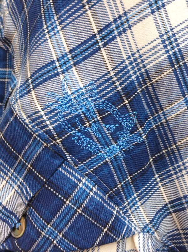 胸元の切り替え部分には、フラップポケットがついています。実際に使えるポケットで、ただの飾りではありません。こういう「機能もきちんとある」という設計、地味にうれしいですよね。