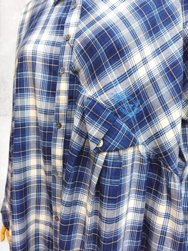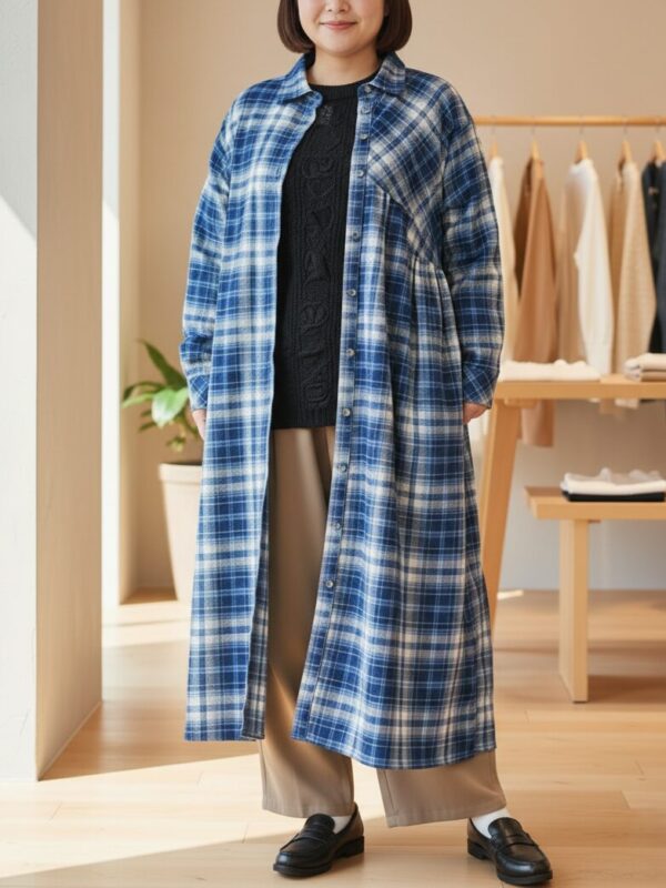 左右非対称感が全体にさりげないメリハリを生んでいて、「よくあるチェック柄じゃないな」という印象につながっています。