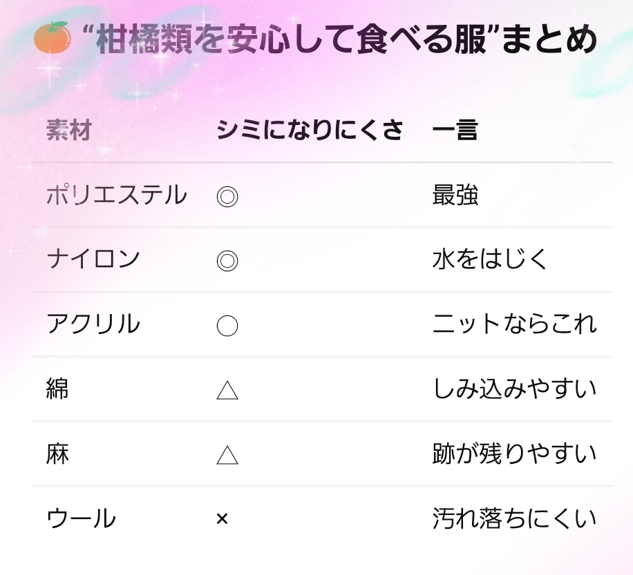 ◉ポリエステルに近く、水を弾きやすい ◉コーティング系『ウィンドブレーカー、エプロン🎽など』は、特に強い ◉果汁がサッと落ちやすい