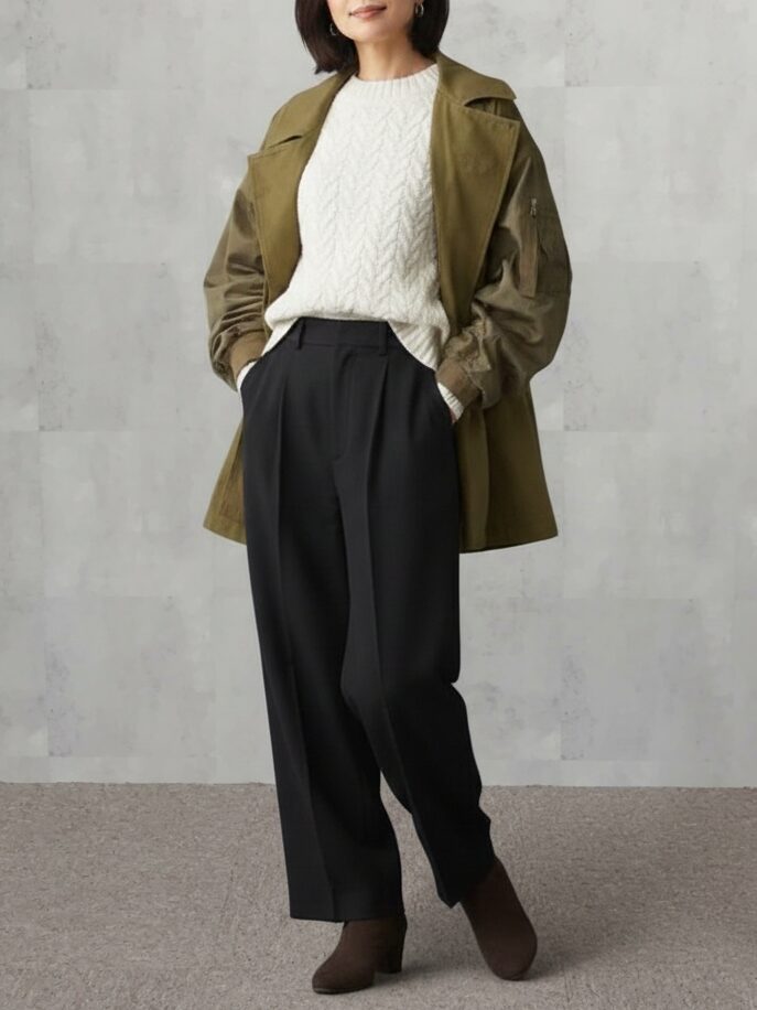 トレンチコートのきちんと感と、MA-1のカジュアル感が、本当に絶妙なバランスなんです。