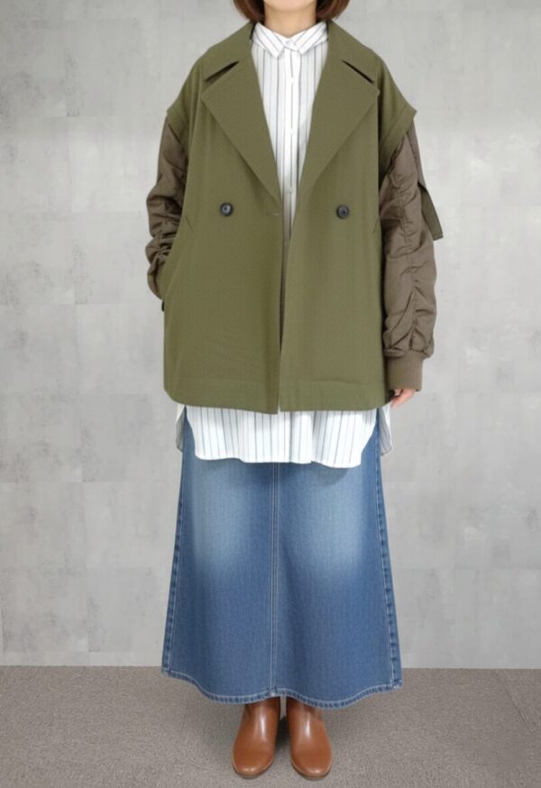 日差しが暖かく感じられる季節の変わり目には袖を外してジレのように着こなすこともできます。
