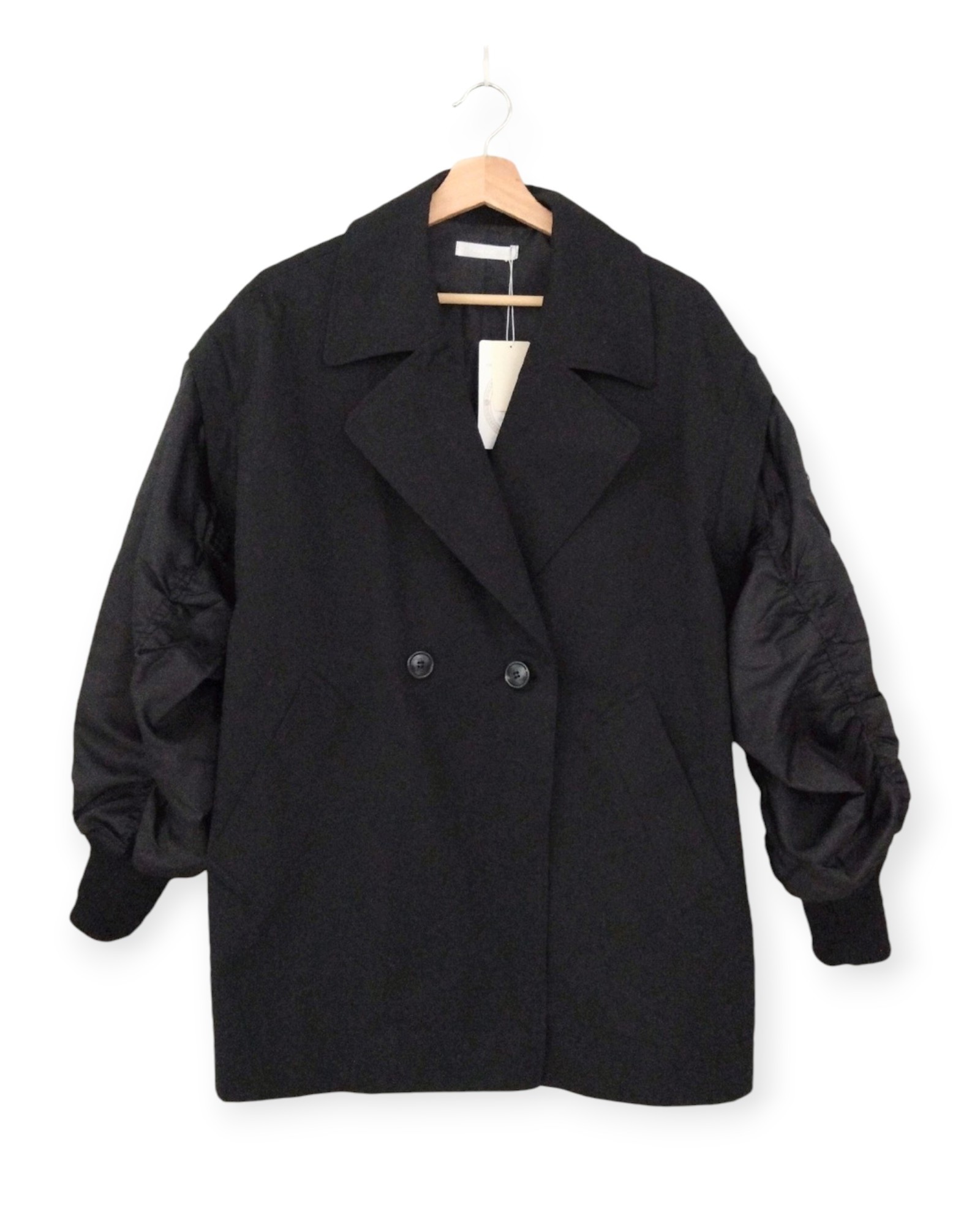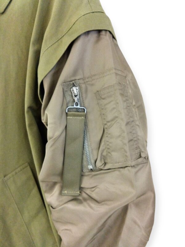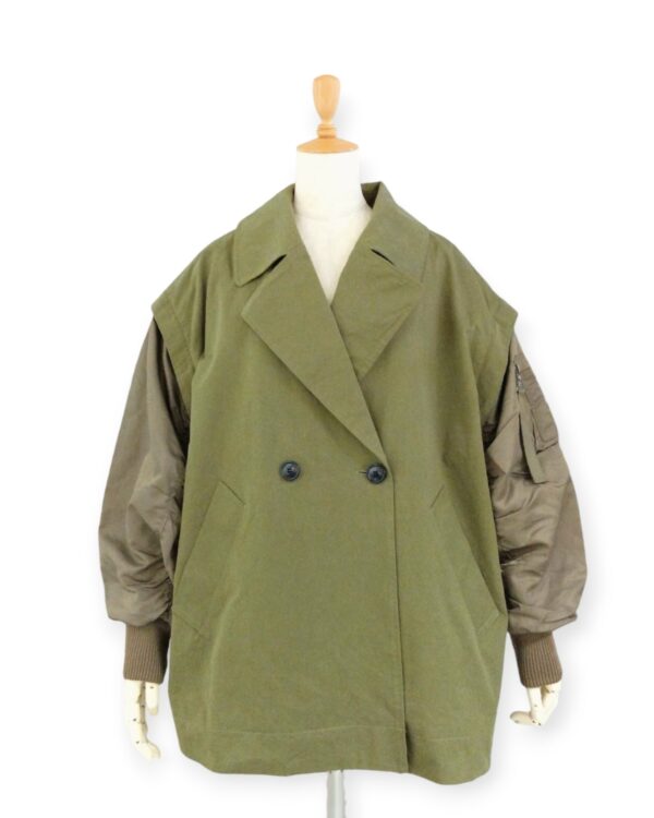 このコートの魅力は、なんといっても定番のトレンチコートに、今っぽさを感じさせる「MA-1スリーブ」を組み合わせた、その斬新なデザインにあります。