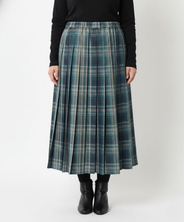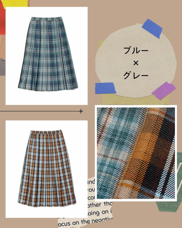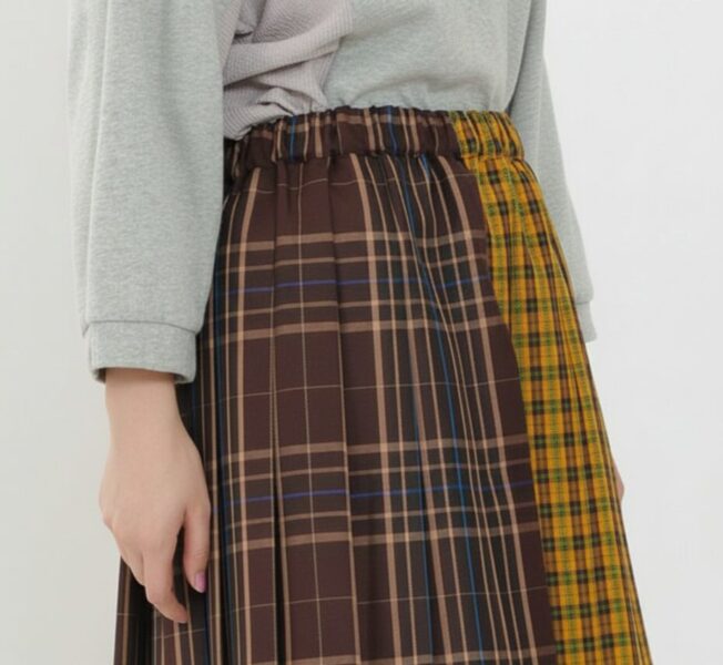 このスカートの最大の魅力は、なんといっても前後で異なる2種類のチェック柄を組み合わせたデザイン。