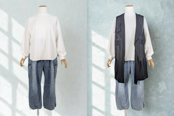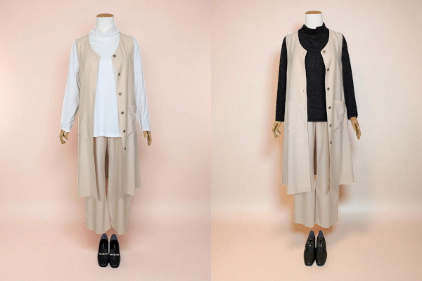ポイントは、「トップスよりも少し長めのベスト」と、「明暗差」で縦ラインを強調することです。ここまで極端にしなくても、少し取り入れるだけで効果のある重ね方です。