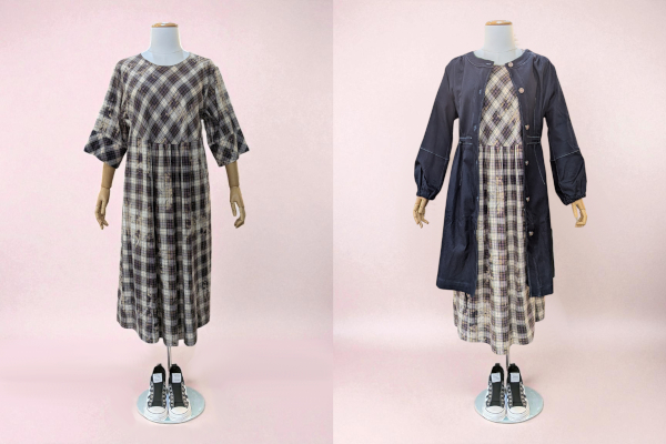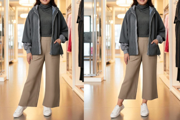 同じく、縦のラインは意識しましょう。ポイントは同じで「長さのバランス」と「明暗差」です。アウターの場合はポイントがもう一点。大きいサイズの方は特に、ウエストにラインがあるデザインを避けがちですが、ウエストに少しだけゴムが入っているとか、紐で絞り調整が出来るデザインのものは積極的に取り入れたいところです。ウエストラインを「作る」ことで、スッキリ見えの効果があります。