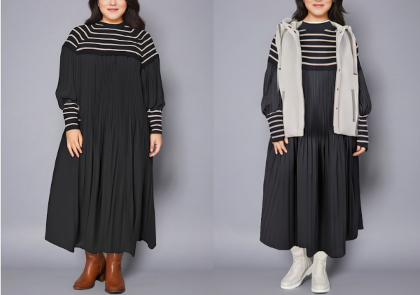 「安心の黒ワンピース。だけど、ちょっと体が大きく見えるかも。」そんな時は、先ほどとは反対に短めのベストで縦ラインを強調します。スッキリ感UP。